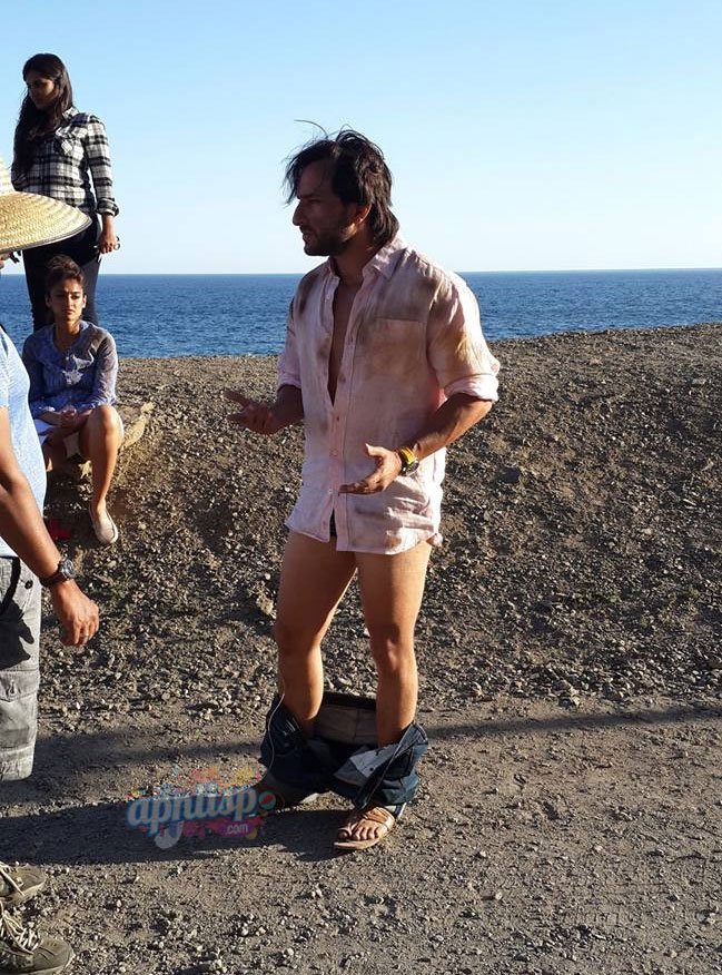 Saif Ali Khan spotted with his pants down on the sets of upcoming movie Happy Ending in California.