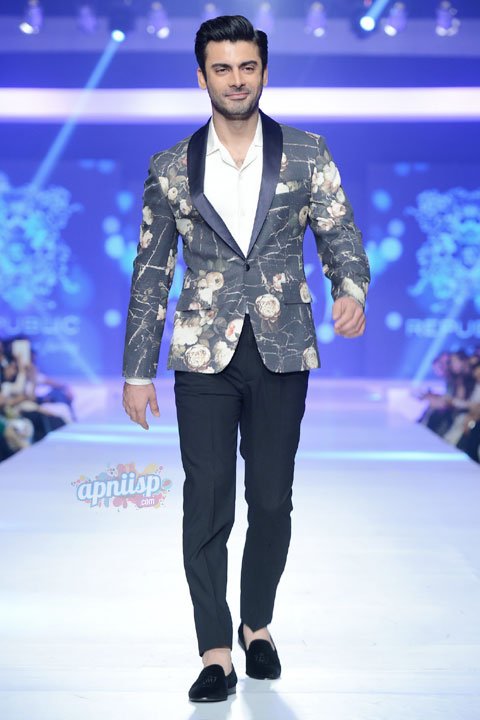 Fawad Khan walks the ramp as a showstopper for Omer Farooq at PFDC in Lahore.