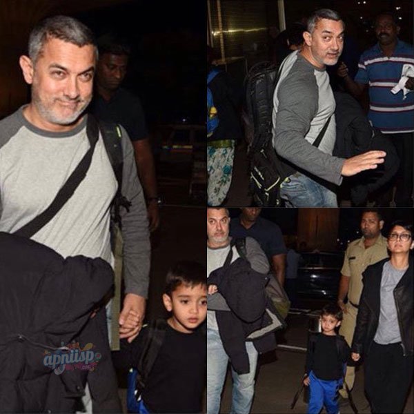 Aamir Khan spotted with his wife & young son while leaving for vacations in Switzerland.